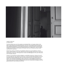 Side A of the record features an audio version of Daniel Laufers video installation. The music for "Train of Thought" is based on musical meditations composed and performed live by organist Markus Hinz (Düsseldorf) and cellist Volker Zander (Köln) at St. Antonius, Düsseldorf. Side B provides a selection of these compositions based only on mental imagery and vague story outlines, recorded in the churches after hours during a late summer night. Simple digital field recording equipment was used in the two hour long session. Extracted from the film the reverb heavy soundtrack material reveal also urban noises like bypassing tram cars on the main street of Oberkassel, Düsseldorf, submitting dark sub-harmonic rumbling crescendos amplified and echoed through the corpus of the historistic church.